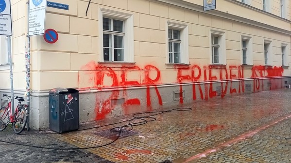 „Revolution beendet Kriege“ und „Der Friede ist rot“ haben Unbekannte an Hauswände in der Regensburger Altstadt gesprüht. Noch hat die Polizei keinen Täter gefunden und bittet um Zeugenhinweise. Der Vorfall ereignete sich am Montagmorgen an öffentlichen Gebäuden am Bismarckplatz, Domplatz und Neupfarrplatz. Die Schriftzüge sind bis zu 20 Meter breit und circa 1,5 Meter hoch. Den Sachschaden schätzt die Polizei auf einen mittleren vierstelligen Betrag. Zeugen sollen sich unter der Telefonnummer 0941/506-2888 oder bei jeder anderen Polizeidienststelle melden.
