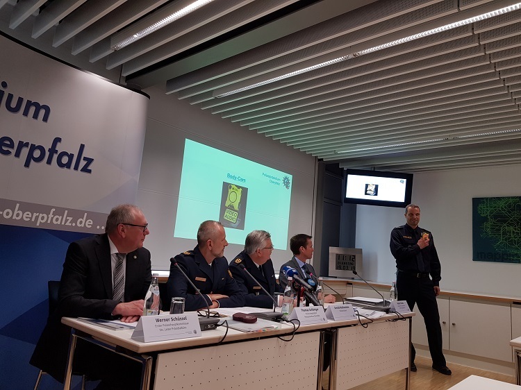 Da die Gewalt gegenüber Polizisten auch 2018 gestiegen ist, setzt die Oberpfälzer Polizei dieses Jahr sog. Body-Cams ein. Hier werden die Kameras vorgestellt (das gelbe Kästchen auf dem Bild im Hintergrund und am Hemd des Polizisten rechts)