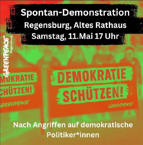 Nach den Angriffen auf Politiker von SPD und Grünen in Deutschland und auf Wahl-Helfer setzt Greenpeace in Regensburg am Wochenende wieder ein Zeichen für die Demokratie. Mit einer Mahnwache in der Altstadt beim Alten Rathaus morgen (Samstag-)Nachmittag ab 17 Uhr. Bei der Mahnwache vergangenen Mittwoch in Regensburg haben Unbekannte die Greenpeace-Demonstranten offenbar ziemlich übel angepöbelt – die Gruppe berichtet, dass sie deswegen die Polizei rufen musste. Aktuell nehmen Übergriffe auf Vertreter von Parteien bayernweit zu laut Medienberichten, besonders auf die Grünen.