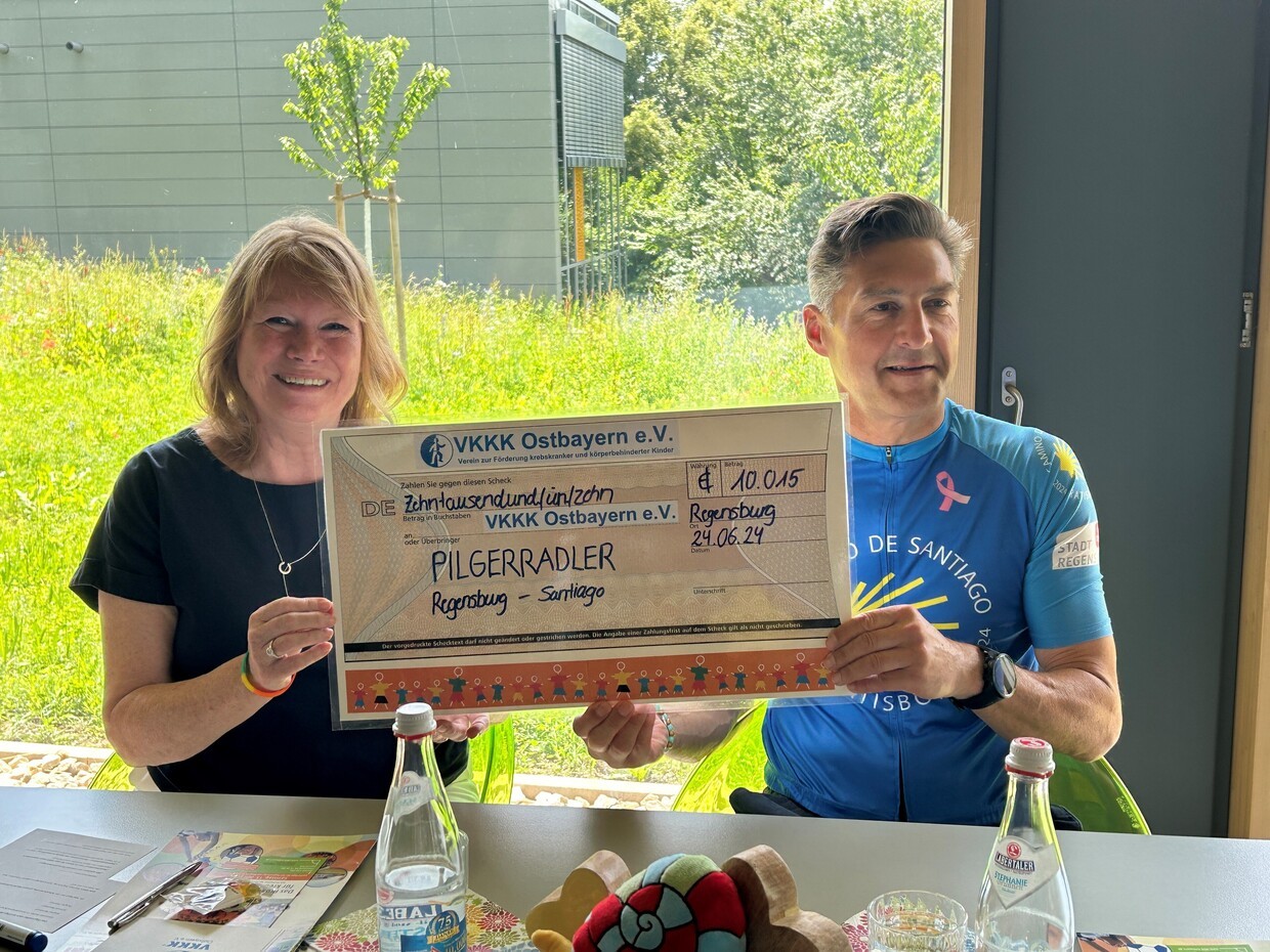 Mit einer sportlich-beeindruckenden Aktion haben vier Freunde aus Regensburg über 10.000 Euro für krebskranke Kinder gesammelt. Die Mitglieder vom Veloclub Regensburg sind den Jakobsweg nach Santiago di Compostella in Spanien geradelt – 2.700 Kilometer nonstop in 24 Tagen und haben dabei um Spenden für den VKKK gebeten, den Verein zur Förderung krebskanker und körper-behinderter Kinder Ostbayern. Die vier Männer waren am 25. Mai los geradelt, seit dem Wochenende sind sie wieder in Regensburg. Und jetzt war auch gleich Spenden-Übergabe beim VKKK – insgesamt sind 10.015 Euro zusammengekommen – diese Summe hat dann auch die Pilger-Radler überrascht und sehr gefreut. Der VKKK investiert das Feld in sein Nachsorgezentrum in Zeitlarn, das soll Ende des Jahres fertig werden.