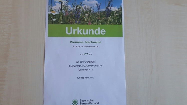 Jeder Blühpate erhält eine persönliche Urkunde und auf der Fläche wird ein Schild mit seinem Namen aufgestellt. Der Blühpate kann sich den Ort im Landkreis Regensburg aussuchen wo die „Blühpatenschaft“ stehen soll.