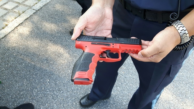 Vor der Übung mussten die Polizisten ihre „scharfen“ Waffen gegen Übungswaffen tauschen, mit der sie Platzpatronen verschießen konnten.