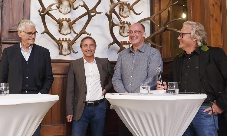 im Bild: v.li. Schauspieler Sky du Mont, Thomas Ruhfaß Stadtmaus, Hubertus Hinse Stadtmaus, Klaus Maria Weigert „micromusic“ bei der Vorstellung des Hörbuchs im Jagdschloss Thiergarten.