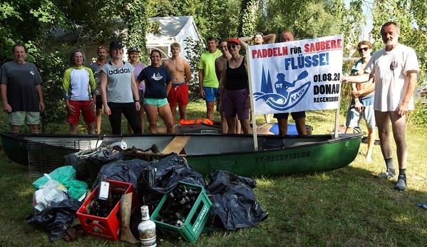 Bei 34 Grad feierten die Kanuten am 01.08. ihr 90-jähriges Bestehen mit der Aktion „Paddeln für saubere Flüsse“. Mit Pfeifen, Greifzangen und Warnwesten ausgerüstet, starteten 15 Mitglieder am Bootseinstieg der RT. Mit so viel Müll hat jedoch keiner gerechnet. Nach nur 30 Minuten war ein großer Kanadier voll und den Kanuten verging ihre gute Laune. Von Flaschen bis zur Autobatterie war alles dabei. Natürlich gab es auch Funde, die jeden zum Schmunzeln brachte, wie ein Damenbein aus Plastik oder eine Flaschenpost für die Oma.