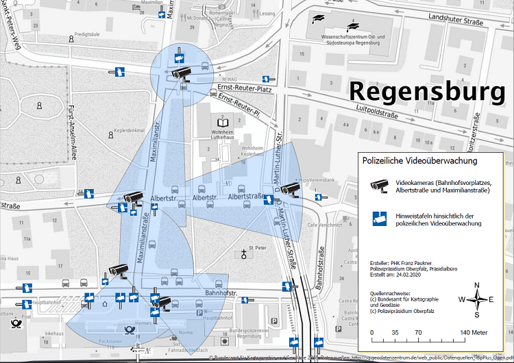 Auch die Speicherung erfolge streng nach den Datenschutzrichtlinien und werde nach 14 Tagen automatisch gelöscht. Verschiedene Sicherheitseinrichtungen, wie unterschiedliche und streng angelegte Berechtigungen der Systembediener, sollen eine rechtskonforme Nutzung der Bildgebung sicherstellen. Der überwachte Bereich sei durch 22 Hinweisschilder weiträumig und unmissverständlich gekennzeichnet (s. Karte unten). Eine automatisierte Gesichtserkennung erfolge nicht, sei mit der Einführung nie ein Ziel gewesen und sei nach dem gültigen Polizeiaufgabengesetz auch nicht zulässig.