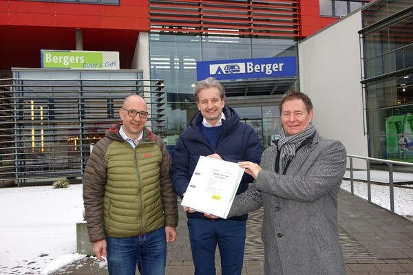 Bild: OB Thumann überreicht im Februar 2022 die Baugenehmigung für die Erweiterung bei Camping Berger an Maurice Perske (links) und Dr. Matthias Herfeld (Mitte)