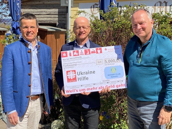 Die ganze Welt schaut schockiert auf den eskalierenden Krieg in der Ukraine. Der Rotary-Club Kelheim/Donau hilft der Caritas Kelheim mit einer vierstelligen Spende. Am 20. April 2022 haben Präsident Robert Gregan und Dieter Scholz an Hubert König, Vorstand der Caritas Kelheim, einen Scheck in Höhe von 5.000,00 Euro übergeben. Hubert König bedankte sich herzlich für die „großzügige Zuwendung“.