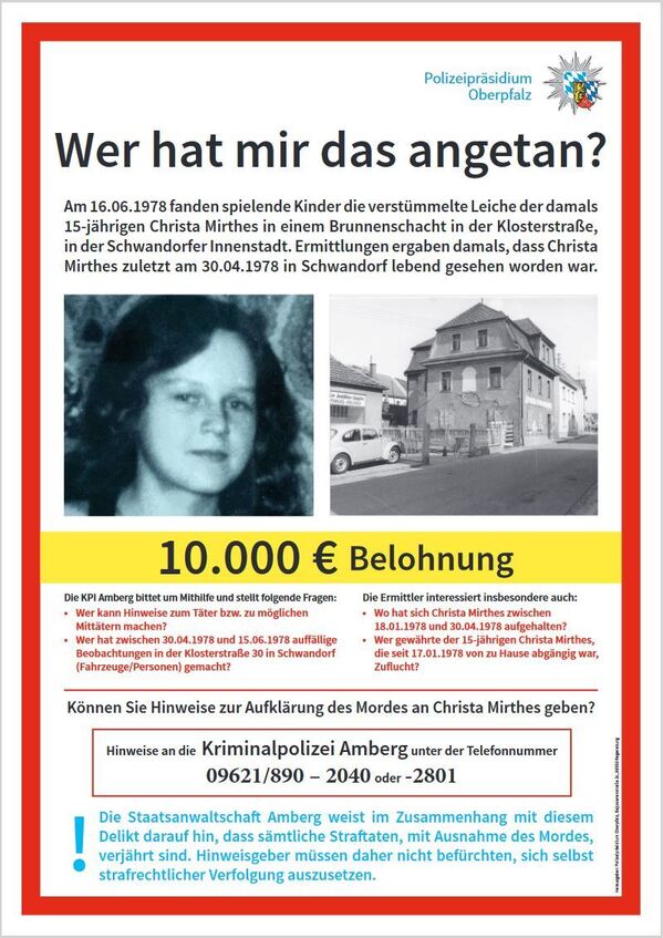 In einem 45 Jahre alten Mordfall ermittelt die Polizei Schwandorf wieder. Es geht um den Mord an der damals 15-jährigen Christa Mirthes. Die Ermittlungen laufen schon seit Anfang des Jahres. Obwohl der Fall so lange zurück liegt, hat die Polizei neue Zeugenaussagen, berichtet Claus Feldmeier vom Polizeipräsidium Oberpfalz: