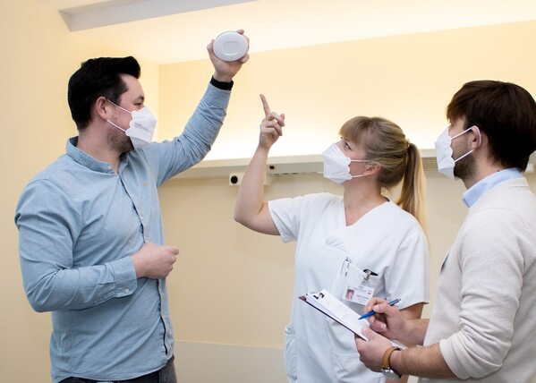 Bild: Projektleiter Andreas Riepl, Carina Arndt, Leitung der alterstraumatologischen Station, und Pflegewissenschaftler Maximilian Schindlbeck begutachten den neuen Sensor