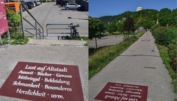 Damit das besser wird, gibt’s jetzt was Neues. Ab dem Damm beim Wördplatz, wo die meisten Besucher parken und per Schiff einlaufen, führen jetzt auffällige Straßenmarkierungen und gemalte Fußspuren bis in die Kelheimer Altstadt. Während Sie der Spur folgen, erfahren Sie über die Markierungen, was die Altstadt so alles zu bieten hat.