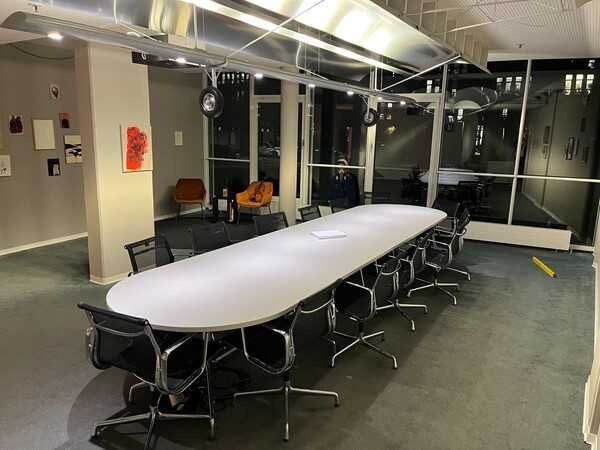 Der Künstler Peter Engel brachte sein Raumkonzept mit folgenden Worten zum Ausdruck: „In meiner Vorstellung sitze ich im Besprechungszimmer und wünsche mir eine gemütliche und sinnliche Atmosphäre. Bilder an der Wand im schwarz-weißen Spektrum mit farbigen Akzenten inspirieren eigene Gedanken oder lenken hin zu neuen Gedanken. Eine Variation aus Tuschezeichnungen, Ölbildern und Mischtechnik in verschiedenen Formaten hängt locker an der Wand und entzieht dem Raum die strenge Büroatmosphäre. Die Farbigkeit der Wände ist satt und erinnert durchaus auch an einen Salon oder ein Museum.“
