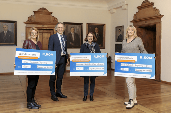 Im Beisein von Regensburgs Oberbürgermeisterin Gertrud Maltz-Schwarzfischer übergab R-KOM Geschäftsführer Alfred Rauscher am 02.02.23 die jeweiligen Spendenschecks in Höhe von 1.560 € an die Aktion Kinderbaum, in Höhe von 790 € an die Regensburger Wohltätigkeitsstiftung – Altersarmut und in Höhe von 820 € an die Soziale Futterstelle Regensburg.