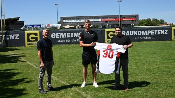 (Bild: Markus Guggenberger überreichte Niklas Rimmel sein Legionäre Trikot und freut sich auf den Saisonstart. (v.l.n.r.: Armin Zimmermann (Vorstand Buchbinder Legionäre), Niklas Rimmel, Markus Guggenberger (Geschäftsführer Guggenberger GmbH).)