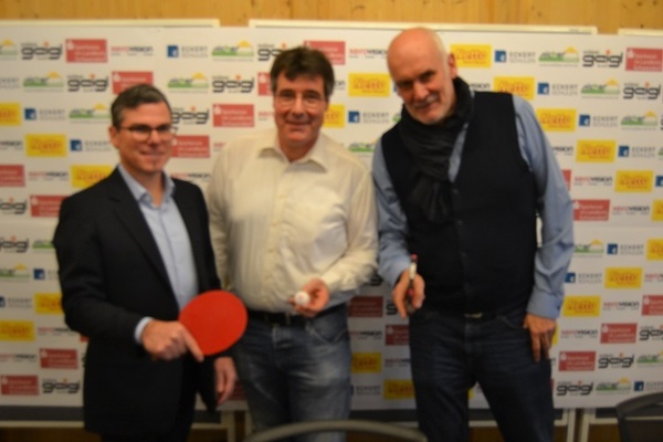 Bundesliga-Tischtennis der Spitzenklasse gibt es am 16.Februar in der Stadthalle Maxhütte-Haidhof. Dort treffen der deutsche Rekordmeister Borussia Düsseldorf und Bad Königshofen aufeinander. Mit dabei sind die Weltklasse-Spieler Timo Boll und Bastian Steger. Organisator Andreas Dinauer ist begeistert von der Resonanz, die Karten waren innerhalb von kurzer Zeit ausverkauft. Genau 1.100 Zuschauer fasst die Halle in Maxhütte. Im Bild: Alexander Schiller ( Pressesprecher Borussia Düsseldorf), Andreas Dinauer ( Organisator), Andreas Albert (Manager Bad Königshofen)