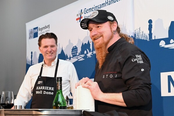 Die perfekte Ausbildung und das perfekte Steak haben eines gemeinsam: Für beides braucht es Leidenschaft und Begeisterung für das, was man tut. Das hat Starkoch Ludwig „Lucki“ Maurer beim IHK-Event „Karriere – Well Done“ am Donnerstag im Römerhof der IHK Regensburg eindrücklich bewiesen. Vor 250 Gästen kochte er mit Unterstützung von IHK-Hauptgeschäftsführer Dr. Jürgen Helmes Steak-Tatar, ein Gericht aus seiner Kindheit, und plauderte aus dem Nähkästchen.