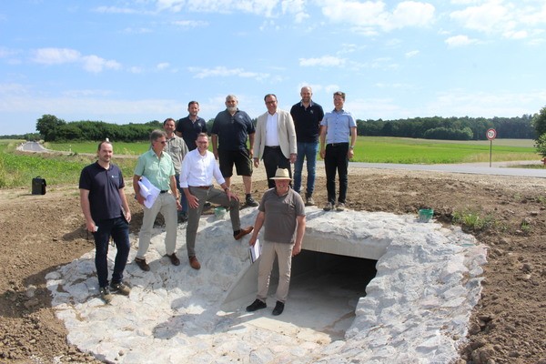 Hubert Karl vom Ingenieurbüro Ferstl, Baudirektor Dr. Christian Thurmaier und Maximilian Frank vom Amt für Ländliche Entwicklung Niederbayern, Christian Geltl von Geltl Tiefbau und sein Bauleiter Johannes Sedlmayer, Stadtrat Reinhard Handschuh, Stadtwerkeleiter Dr. Rainer Reschmeier, Abwassermeister Konrad Ettengruber, Tobias Schreml von der Kämmerei der Stadt Abensberg und Abensbergs 2. Bürgermeister Dr. Bernhard Resch trafen sich an der Großmultenstraße, um die Flutmulde und die dazu gehörigen Vorrichtungen zu begutachten.
