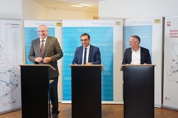 von links nach rechts: Bezirketagspräsident Franz Löffler, Staatsminister Klaus Holetschek und der Vorsitzende des AWO-Landesverbandes Bayern, Stefan Wolfshörndl.
