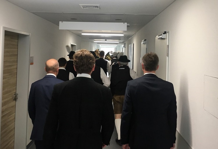 Prof. Nerlich wurde mit Blaskapellen-Begleitung durch das halbe Krankenhaus St. Josef in den Hörsaal gebracht, wo die Verabschiedungsfeier stattgefunden hat.