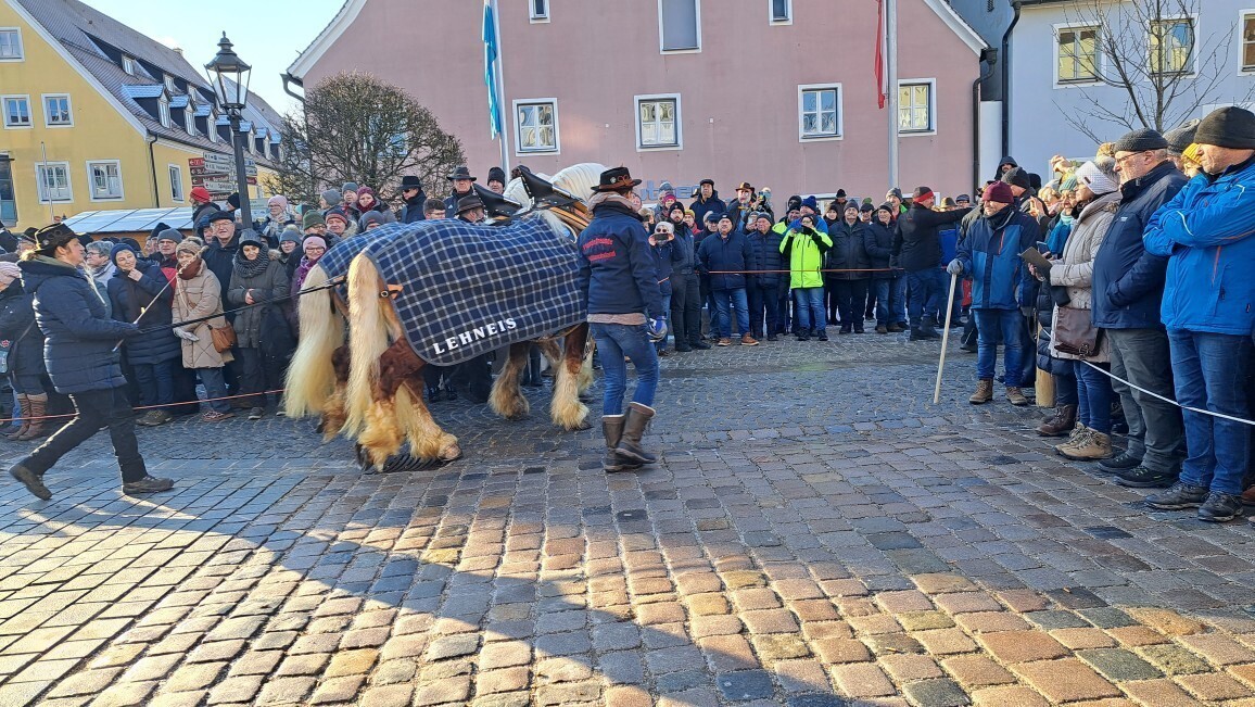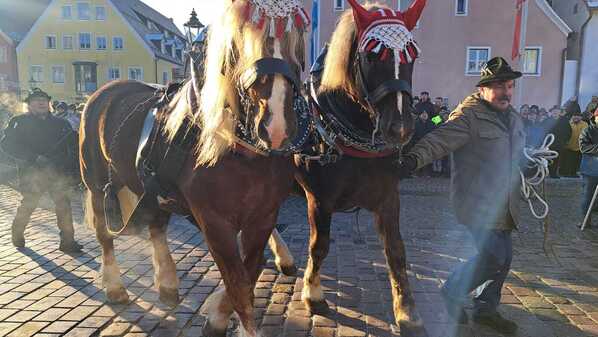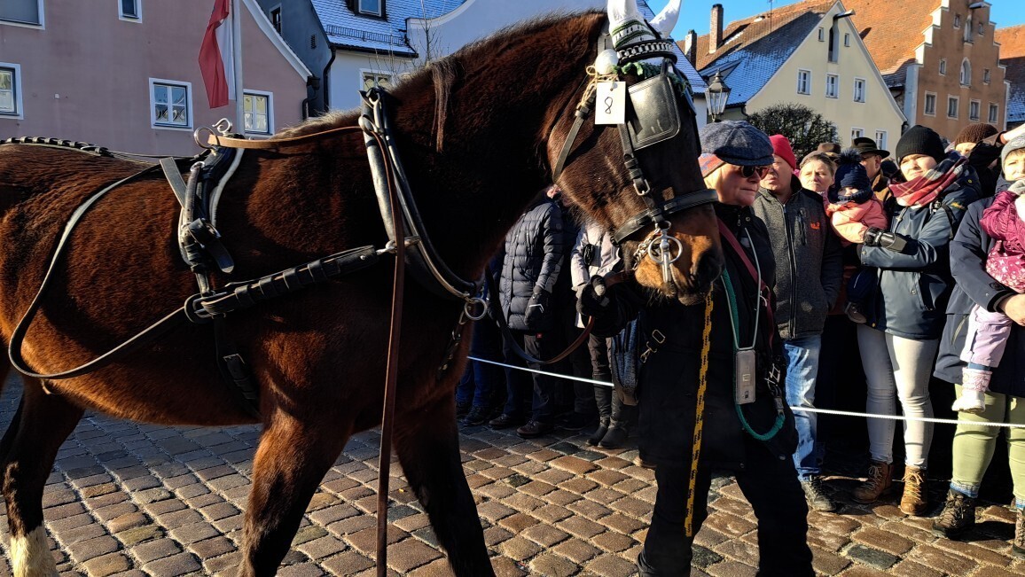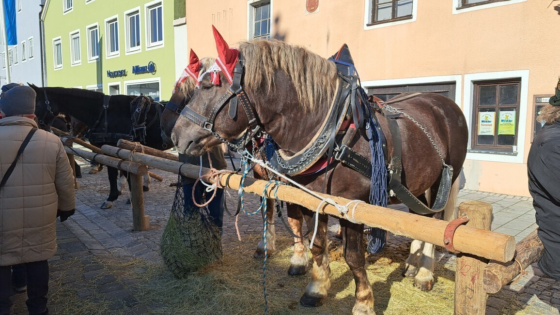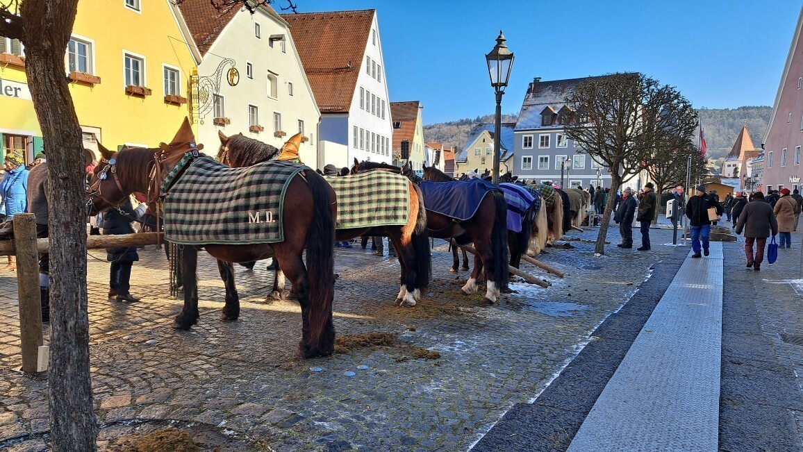 Bei prächtigstem Winterwetter ist heute in Berching im Landkreis Neumarkt der Rossmarkt gestartet. Zwei Jahre lang musste das größte Wintervolksfest Bayerns wegen Corona pausieren. Der traditionelle Pferde-Auftrieb mit über 100 geschmückte Pferde und Kutschen ist pünktlich um 9 Uhr gestartet. Das erste Mal mit dabei ist auch eine Pferdestaffel der Polizei Nürnberg. Als Redner ist dieses Jahr Ministerpräsident Markus Söder in Berching. Es ist heute schon sein vierter Rossmarkt-Besuch, aber der erste als Landesvater.