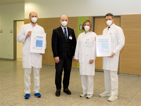Freuen sich gemeinsam über die beiden Auszeichnungen: Geschäftsführer Dr. Thomas Koch mit Klinikdirektor Prof. Dr. Johannes Zellner (r.) und den Oberärzten Ulrike Markert sowie Dr. Michael Galler.