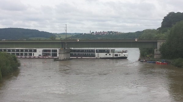 An einer Eisenbahnbrücke über die Donau im Landkreis Kelheim hat sich heute früh ein Kreuzfahrtschiff quergelegt. Derzeit läuft die aufwändige Bergung. Es war schon die zweite Havarie auf dem Fluss innerhalb von 24 Stunden.