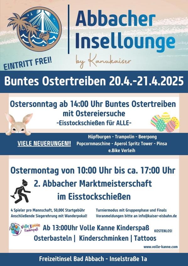 In Bad Abbach öffnet jetzt zu Ostern wieder die Abbacher Insellounge. Da können die Kinder kostenlos Basteln und sich schminken lassen, es gibt eine Hüpfburg, kleine Geschenke sind versteckt… es gibt leckere Pinsas – das sind so Pizza-ähnliche belgete Brote… ihr könnt dort Beerpong spielen &&& – Das Beste: Der Eintritt ist auch noch kostenlos.