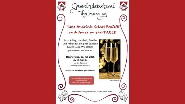 In der Bücherei in Thalmassing ist am Donnerstag Ladies Night. Lasst Job, Familie und Haushalt für einen Abend hinter euch und feiert zusammen. Für Speis und Trank ist gesorgt. Kommt am Donnerstag einfach vorbei. Um 18 Uhr geht’s los.
