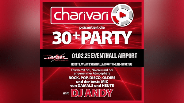 Am Wochenende steht eine Party an – ey die ist mal wirklich cool! Auf der charivari-30plus-Party im Airport in Obertraubling tanzt ihr am Samstag-Abend zu mehr Hits, mehr Vielfalt und feiert mit Leuten in Eurem Alter. Vier Tage ist noch Zeit für die Organisation eines Babysitters. Die Tickets – die schenken wir Euch – im laufenden Programm von charivari.