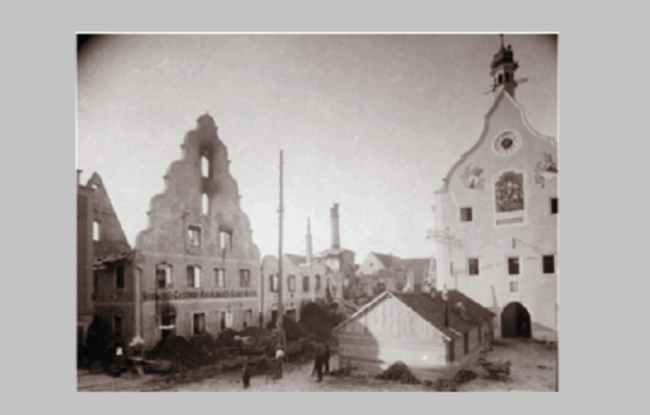 BU: Das Kuchlbaueranwesen am Stadtplatz fiel 1904 einem verheerenden Brand zum Opfer (Foto: Stadtmuseum Abensberg)